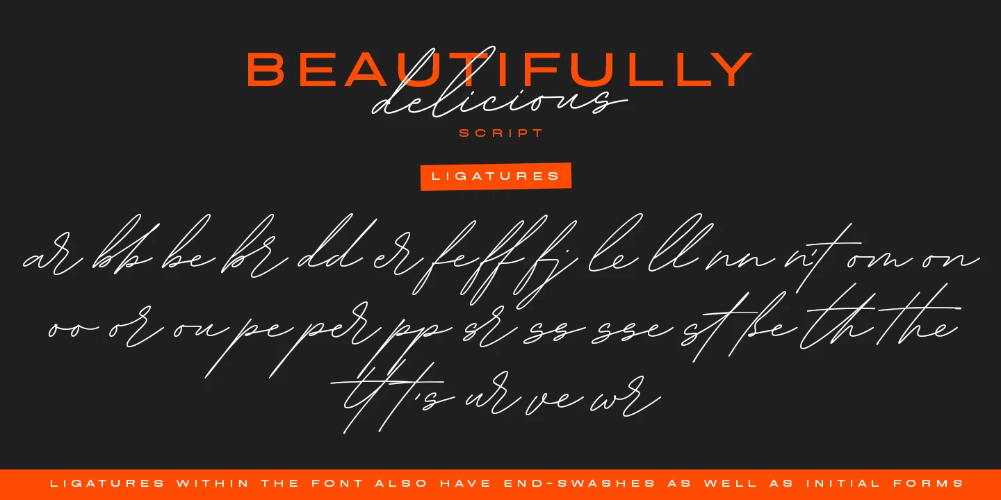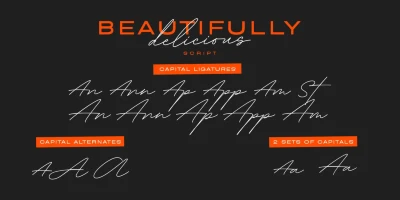 Beautifully Delicious is a font family that combines an elegant extended sans serif with a signature script. Both styles create a harmonious union that can enhance your designs in the best possible way. The script is enriched with ligatures, swashes, and alternates to create perfect word shapes. The modern sans design has unexpected curves and alternates to add unexpected detail. The family is suitable for graphic design, quotes, branding, social media ads, magazines, greeting cards, packaging etc.