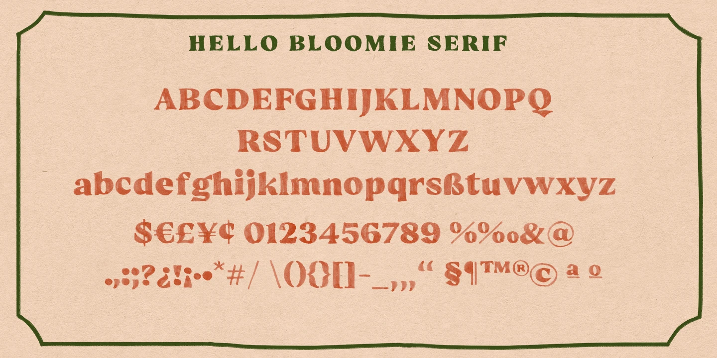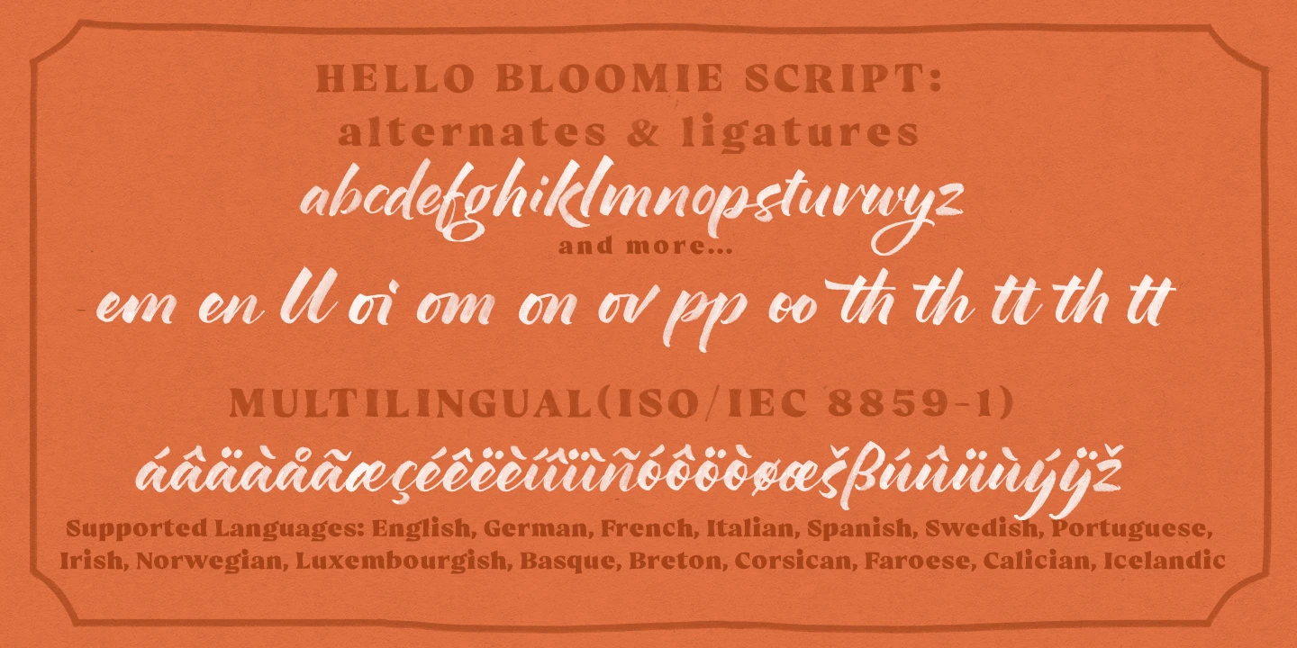 Hello Bloomie is an inky, hand-lettered family with 2 styles: brush script and bold serif. This uniquely complementary family benefits from ligatures, alternates, and a few design elements, allowing you to create unique designs with an authentic hand-drawn look. Hello Bloomie is perfect for branding, greeting cards, packaging design, web design, and publication design, too!