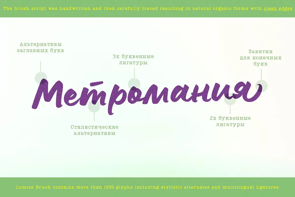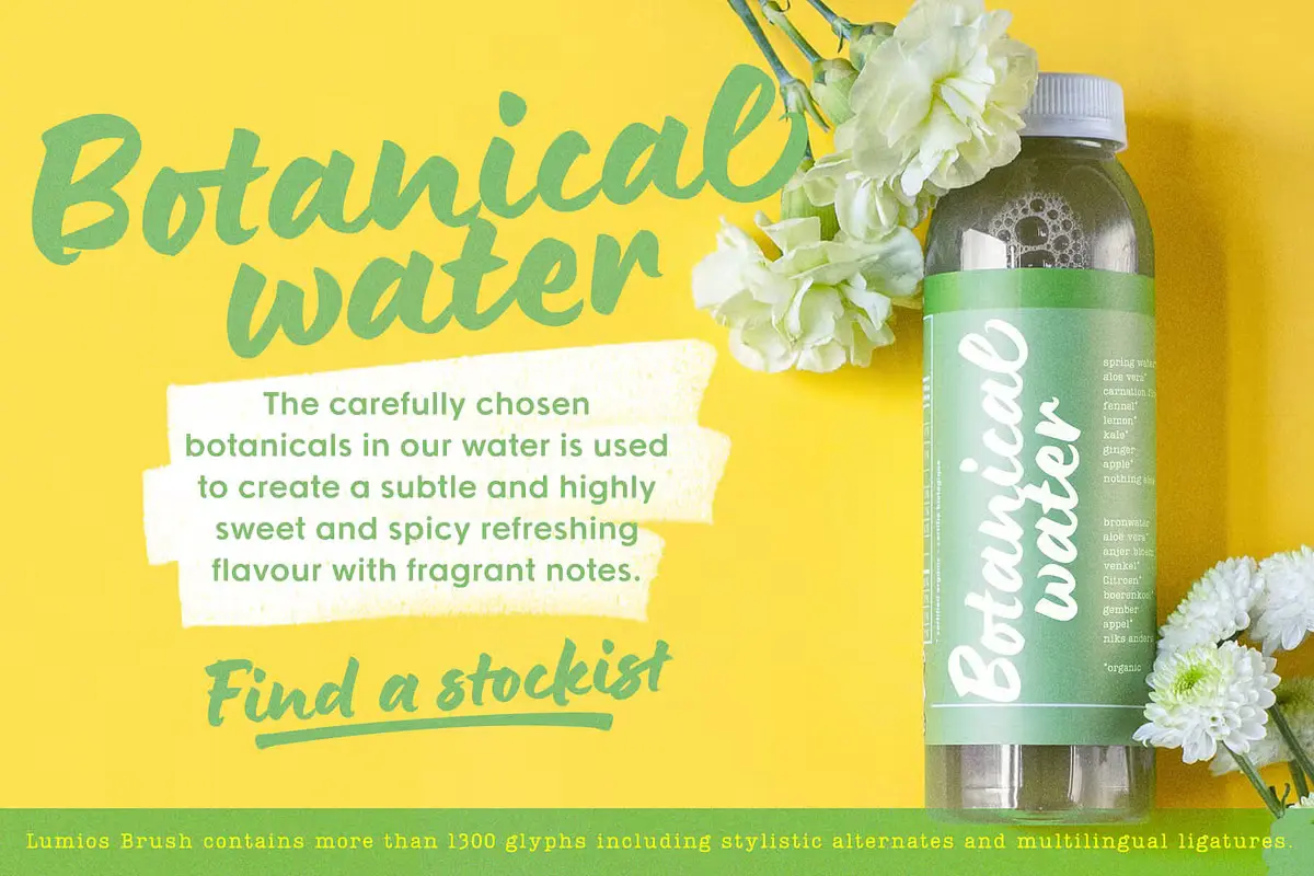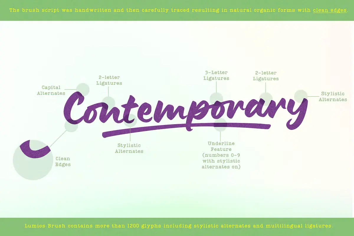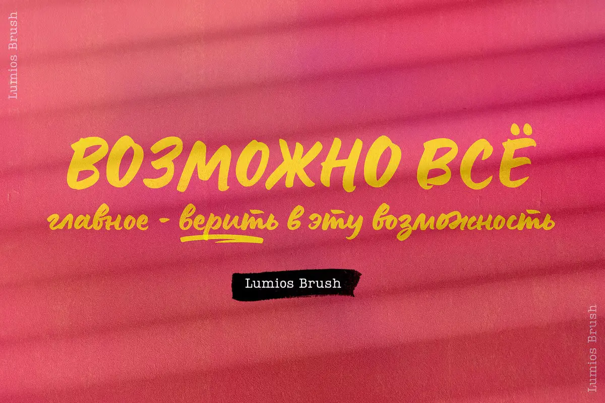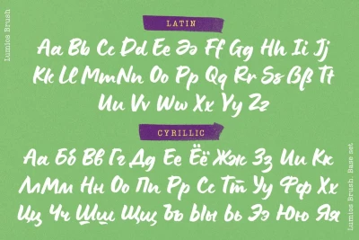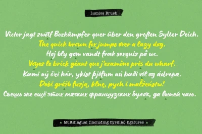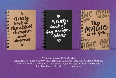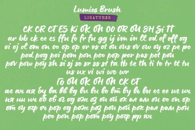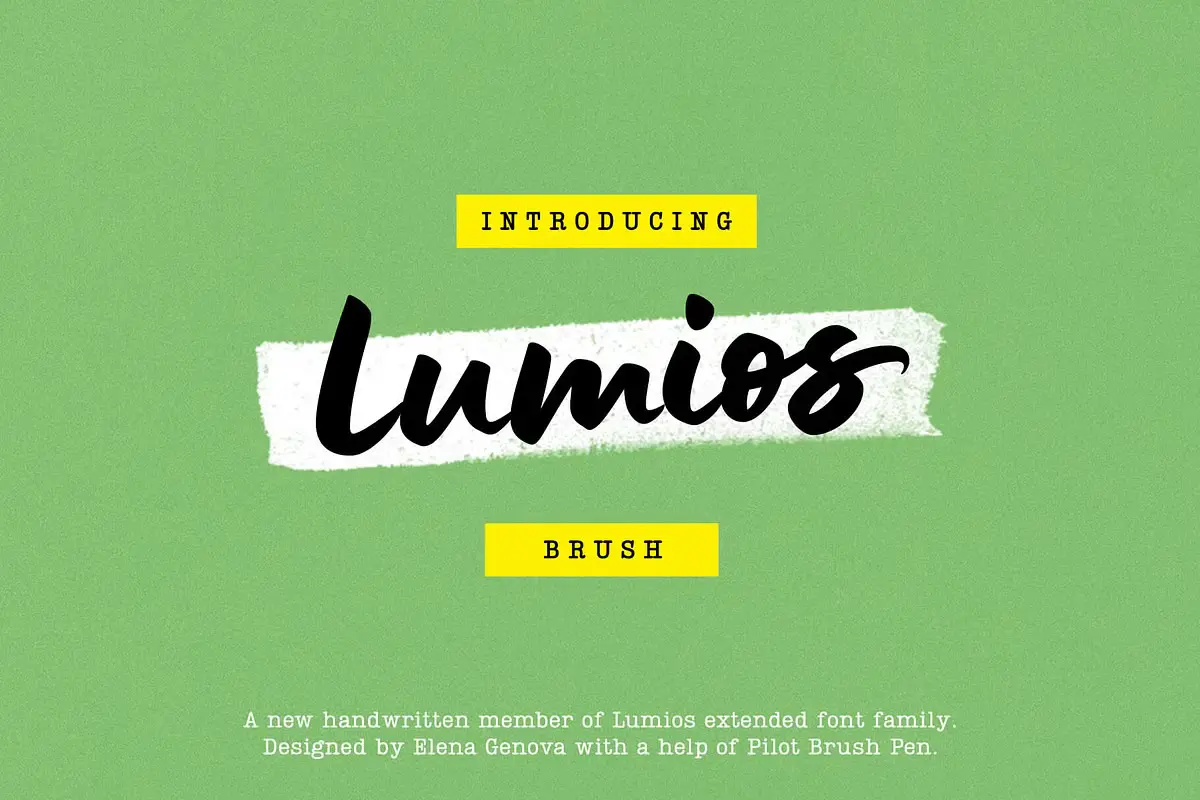 Lumios Brush is a contemporary hand-lettered typeface in the Lumios family. It was written using a Pilot Brush Pen on glossy paper, allowing smooth movement and clean edges. Like Lumios Marker, this Brush sibling is multilingual with Latin and basic Cyrillic support. The use of this design will also benefit from 2- and 3-letter ligatures, stylistic alternates and swashes, underlines, arrows, and a few heart symbols, giving the words a more spontaneous, authentically lettered look.