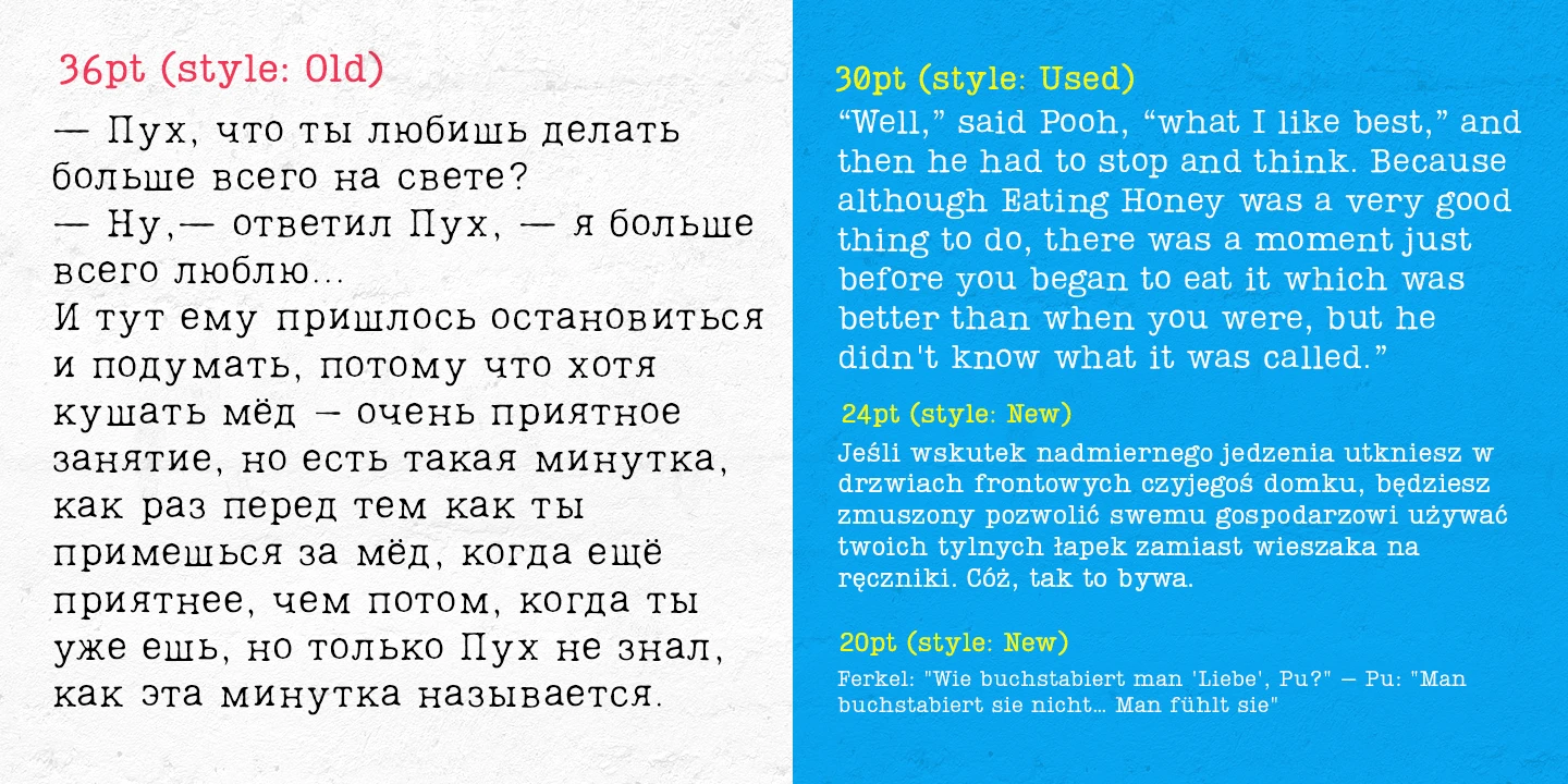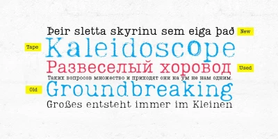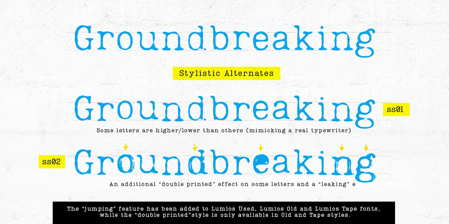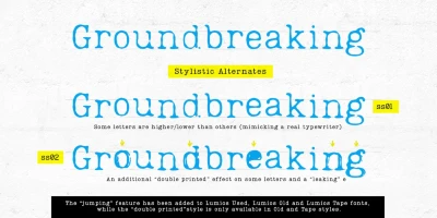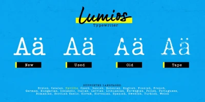Lumios Typewriter is a distinctive slab serif font in the Lumios family. It was inspired by various details found in old typewritten letters. There are 4 unique styles: New, Used, Old, and texturized Tape. Different effects and stylistic alternates further enhance the achievable realistic look with these multilingual (Latin and basic Cyrillic) fonts. Lumios Marker is a great choice for websites, packaging, editorial, branding, posters, greeting cards, and billboards.