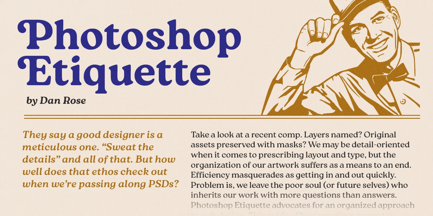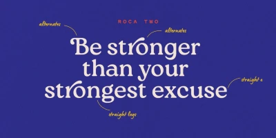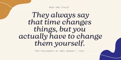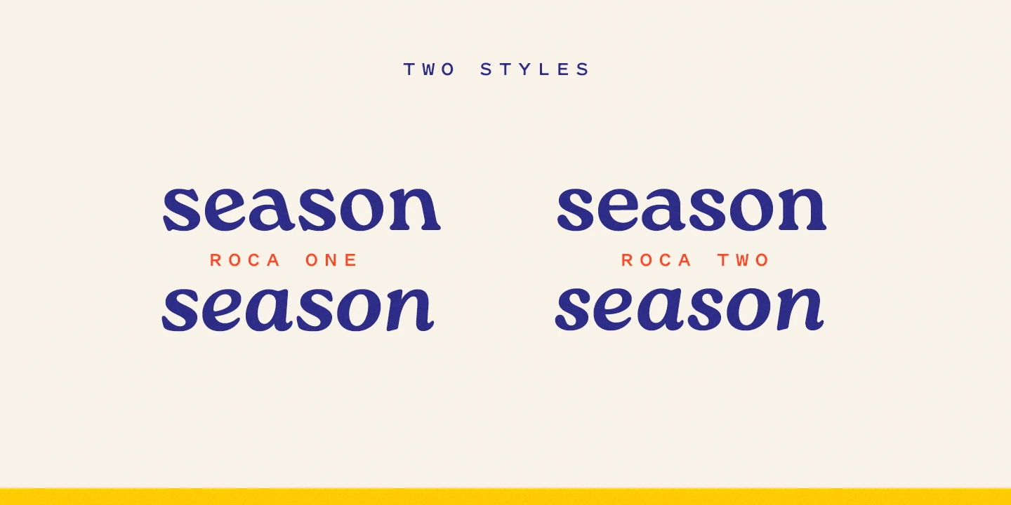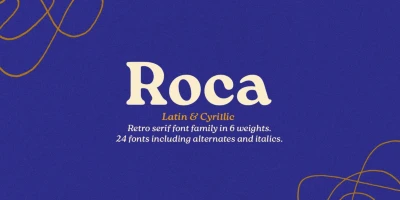 Roca is a soft serif steeped in the spirit of the 60s and 70s. Initially started as an extension to Praline MCL, it transformed into a new font family influenced by the same fonts — Windsor and Cooper Black — the hits of the 60s and 70s, with a hint of Bookman. Roca is available in 6 weights that can be mixed and matched, including 2 stylistic sets, with alternates and true italics. Language support includes most of Europe and Cyrillic (Russian and Ukrainian).