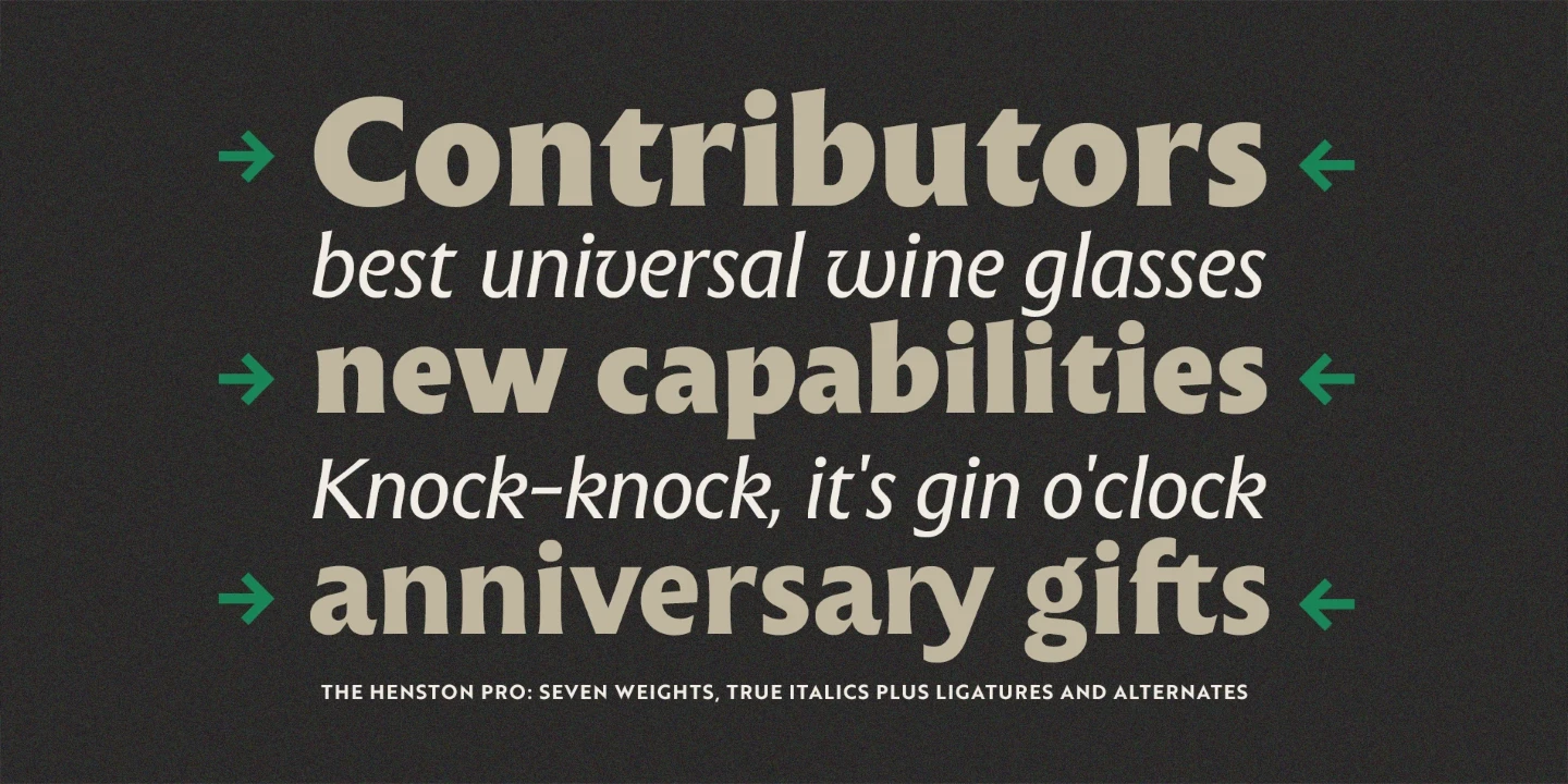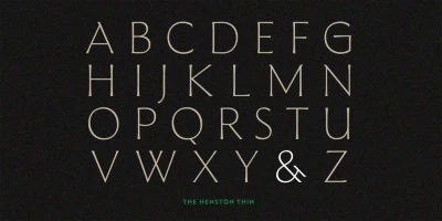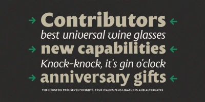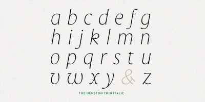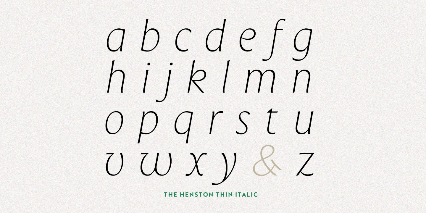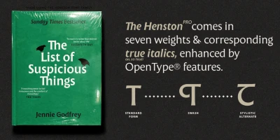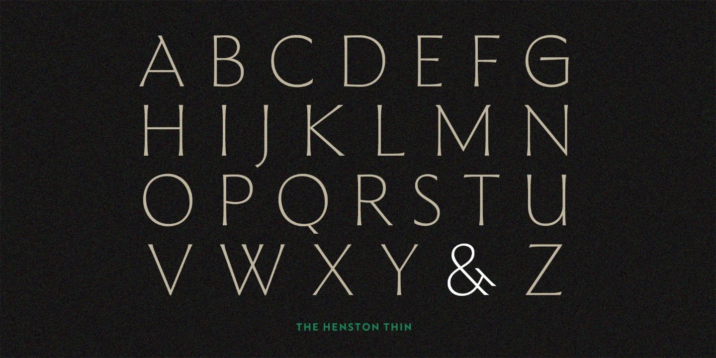 The Henston is a flared serif font family inspired in part by incised letterforms, such as Berthold Wolpe’s Albertus and Hermann Zapf’s Optima. Its subtle shaping is ideal for display, yet the open forms maintain legibility at subhead and text sizes. The companion italics take cues from calligraphy, and with ligatures and alternates, these typefaces will enhance websites, magazines, book covers, and branding. Available in seven weights — Thin to Black — The Henston adds warmth to any project.