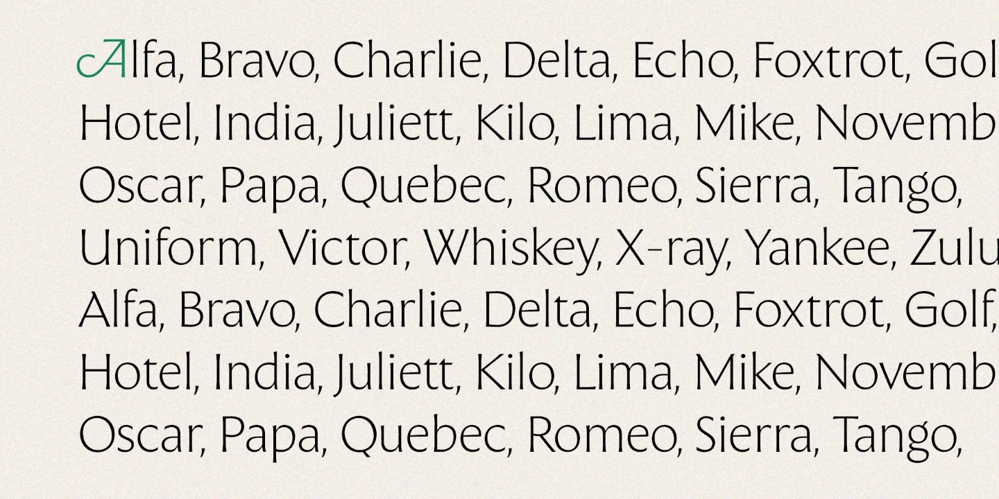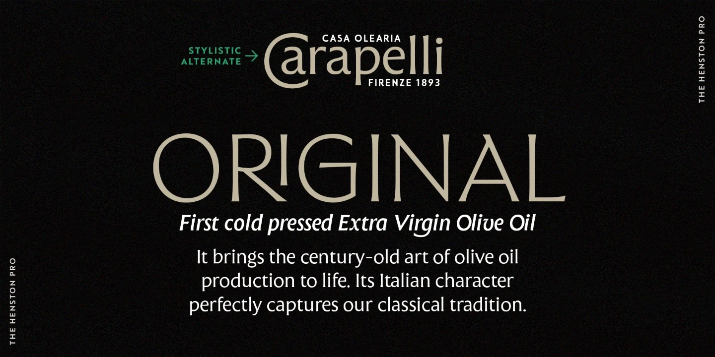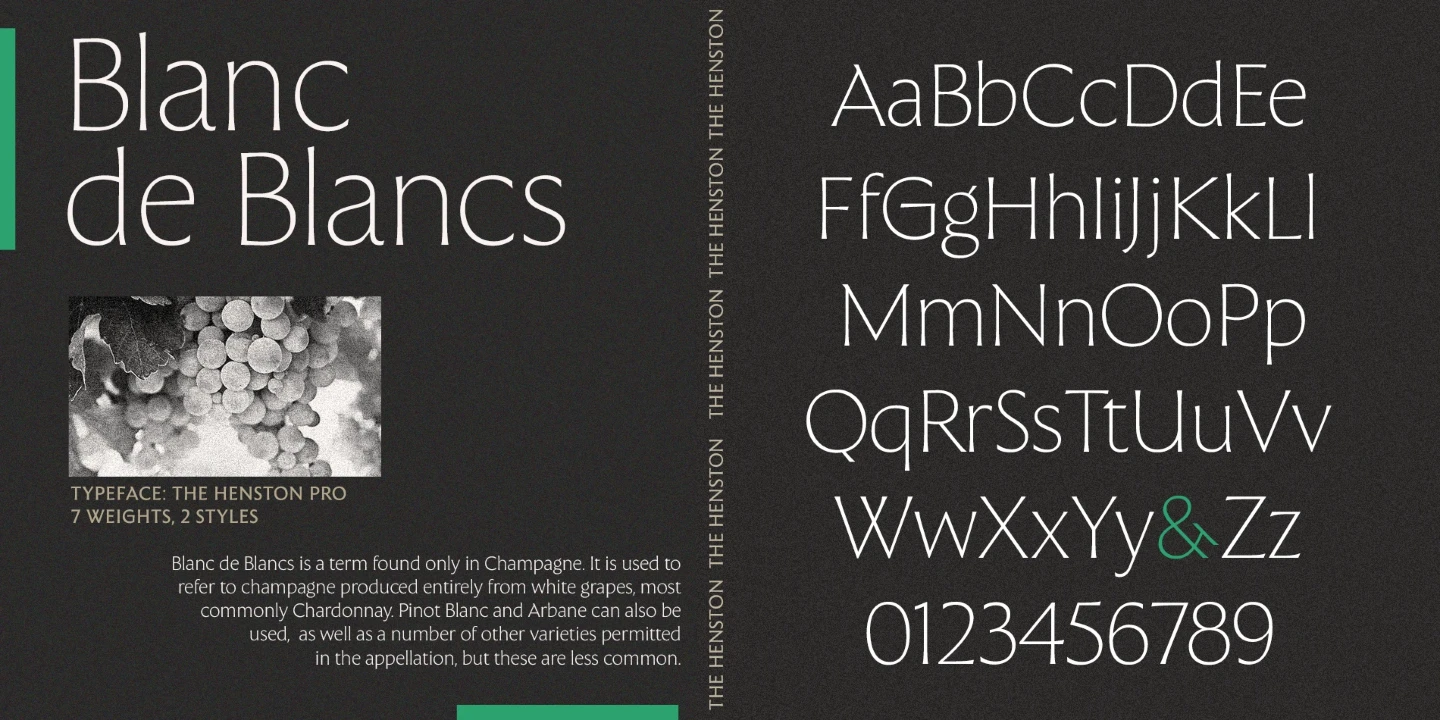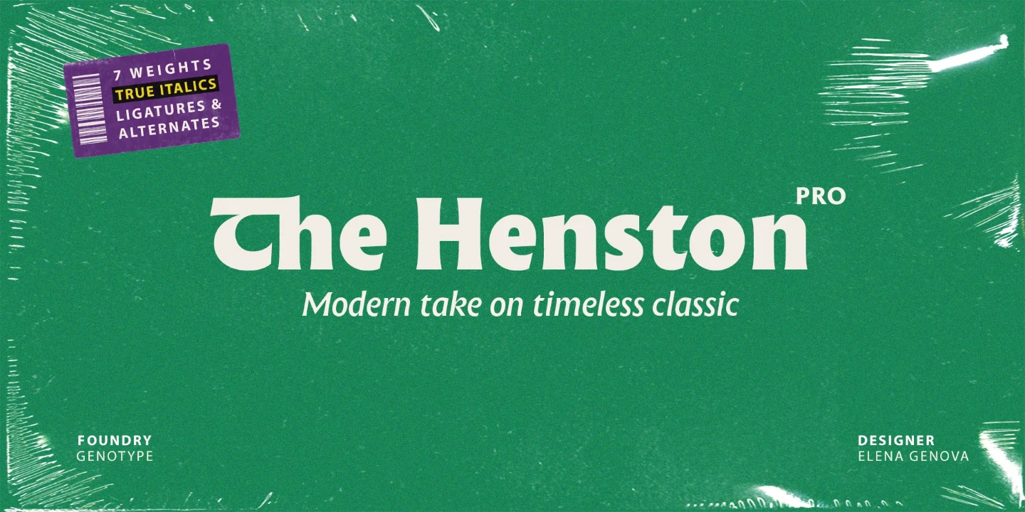 The Henston is a flared serif font family inspired in part by incised letterforms, such as Berthold Wolpe’s Albertus and Hermann Zapf’s Optima. Its subtle shaping is ideal for display, yet the open forms maintain legibility at subhead and text sizes. The companion italics take cues from calligraphy, and with ligatures and alternates, these typefaces will enhance websites, magazines, book covers, and branding. Available in seven weights — Thin to Black — The Henston adds warmth to any project.