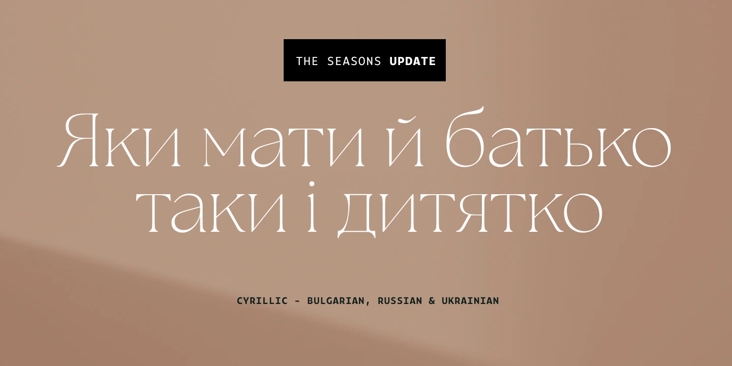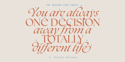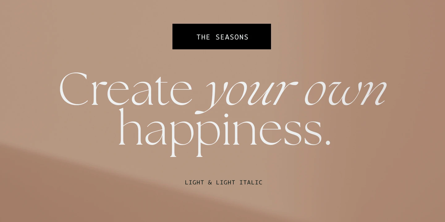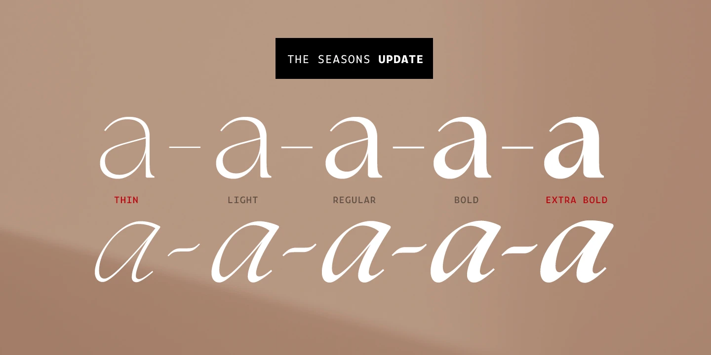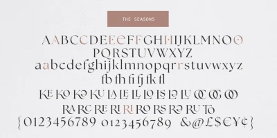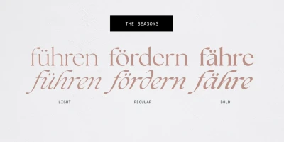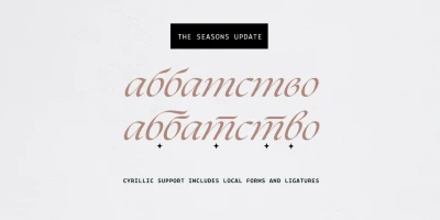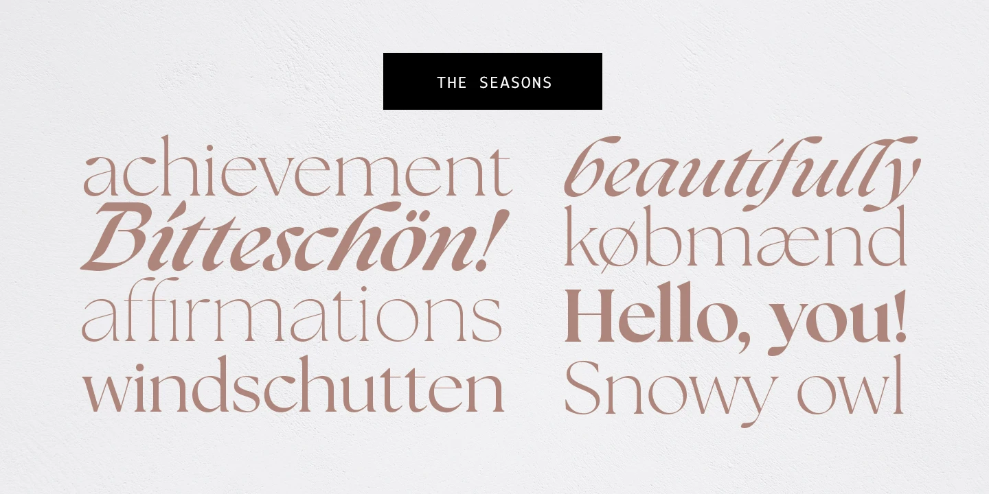 The Seasons is an elegant serif family with a strikingly chic look. The companion calligraphic italics are based on humanistic scripts and written using a Pilot Parallel Pen. The design is further enhanced with ligatures and stylistic alternates. All weights — Thin to ExtraBold — share the same style of softly sheared terminals and sharply dramatic curves, making them perfect for branding, logos, magazines, product packaging, and invitations. Language support includes Extended Latin and Cyrillic.