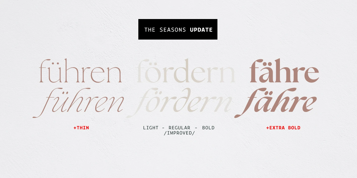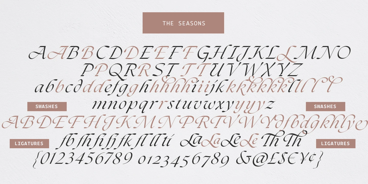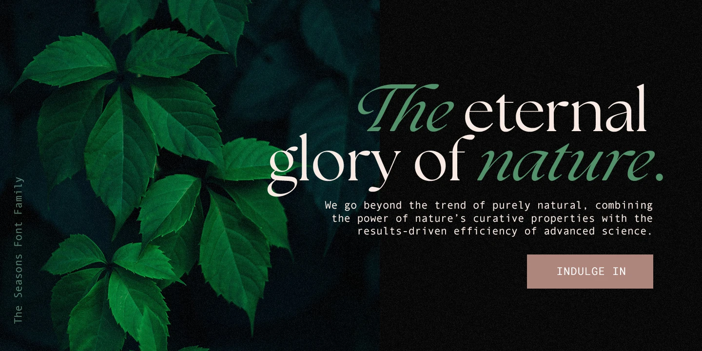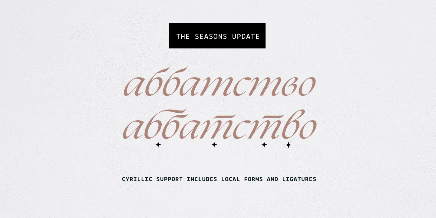 The Seasons is an elegant serif family with a strikingly chic look. The companion calligraphic italics are based on humanistic scripts and written using a Pilot Parallel Pen. The design is further enhanced with ligatures and stylistic alternates. All weights — Thin to ExtraBold — share the same style of softly sheared terminals and sharply dramatic curves, making them perfect for branding, logos, magazines, product packaging, and invitations. Language support includes Extended Latin and Cyrillic.