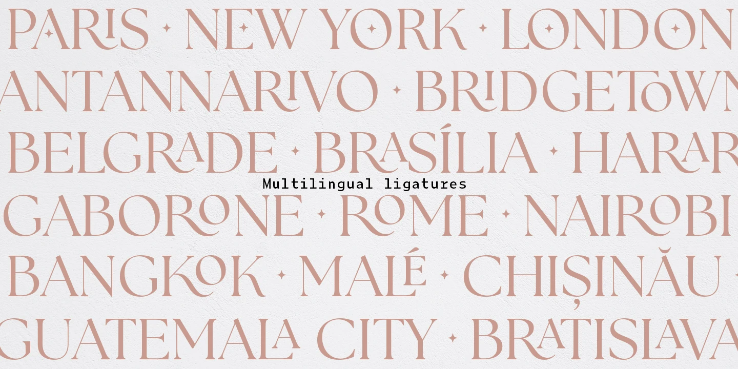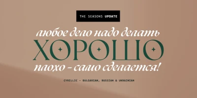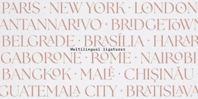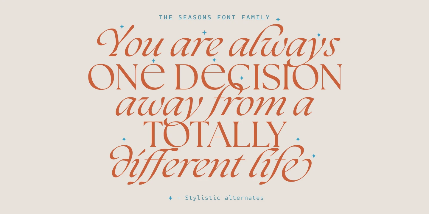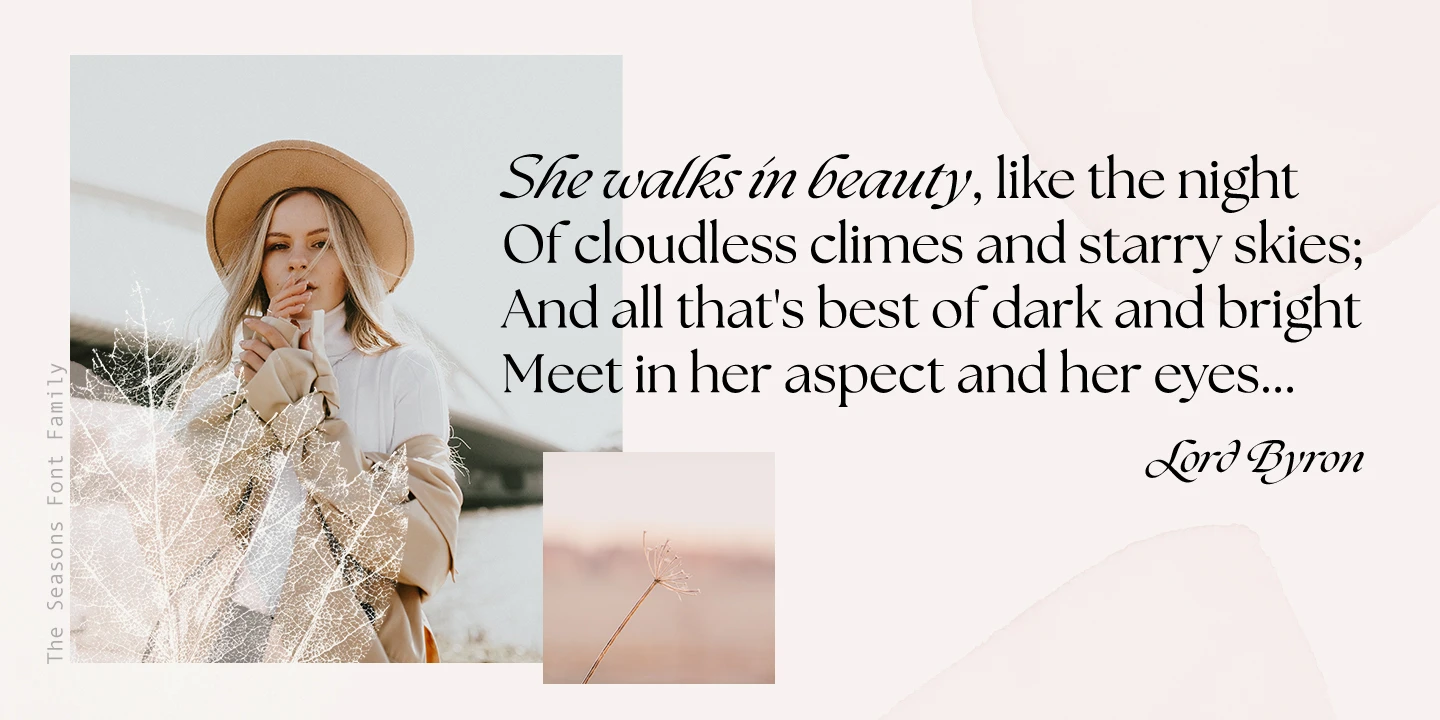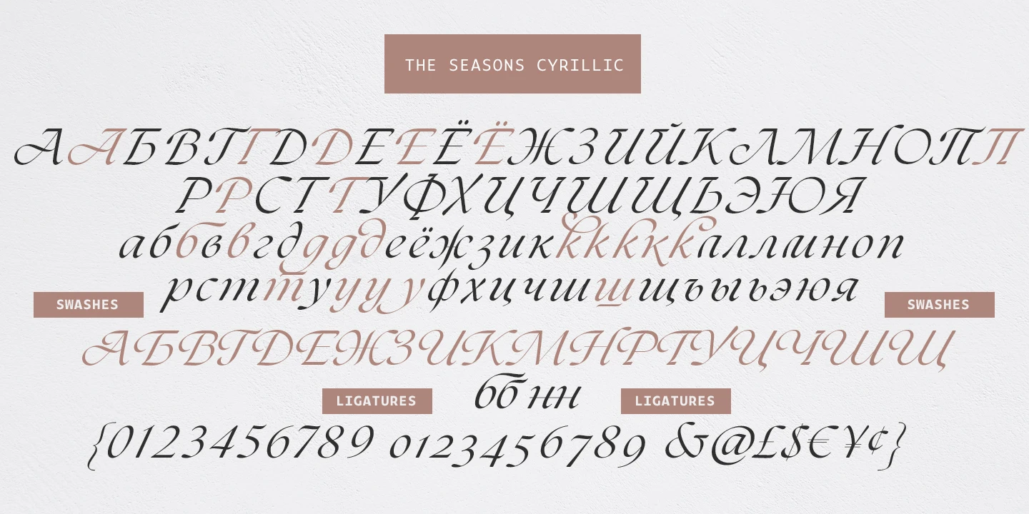 The Seasons is an elegant serif family with a strikingly chic look. The companion calligraphic italics are based on humanistic scripts and written using a Pilot Parallel Pen. The design is further enhanced with ligatures and stylistic alternates. All weights — Thin to ExtraBold — share the same style of softly sheared terminals and sharply dramatic curves, making them perfect for branding, logos, magazines, product packaging, and invitations. Language support includes Extended Latin and Cyrillic.